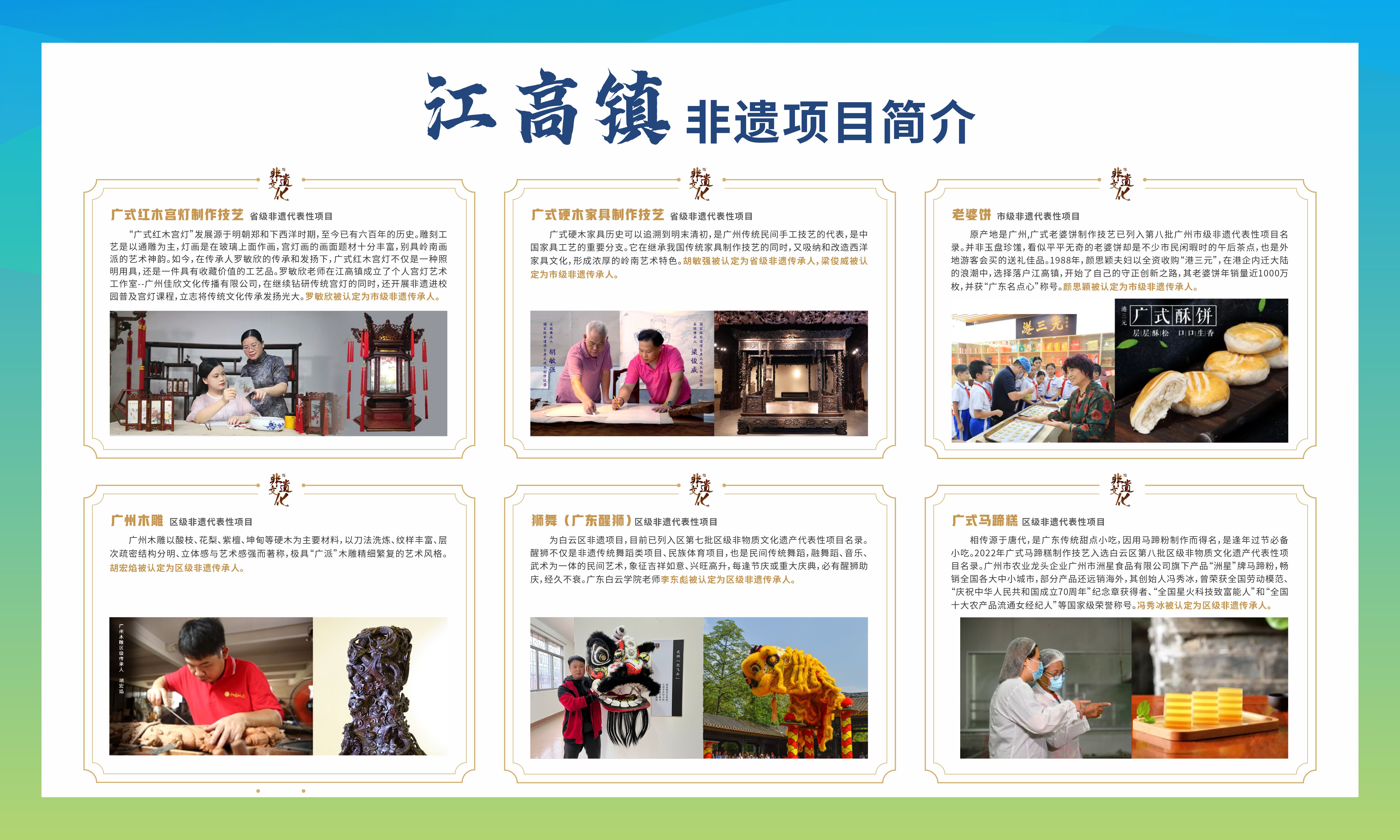 以“弘扬传统文化,传承红色基因,树立江高文化自信”为主线,持续擦亮江高文化名片。围绕巴江河-流溪河生态景观廊道建设,增添文化元素,丰富文化内涵,打造具有江高气息的“巴江河美丽乡村游”文旅路线。依托粤汉铁路大桥遗址、禺北抗日纪念亭、迪士普音响博物馆、松园广作家具博物馆、广式红木宫灯传习基地、文搏3D打印科普研学基地、巴江河美丽乡村群等文化基地,发展“爱国主义教育基地+非遗文化体验游+现代科技体验游”旅游路线。通过举办“传统文化培训班”“科普研学教育培训班”“博物馆藏品鉴赏”等活动,进一步推广广式红木宫灯制作技艺、广式硬木家具制作技艺两项省级非物质文化遗产和舞火龙、醒狮习俗,打造江高特色文化精品项目。