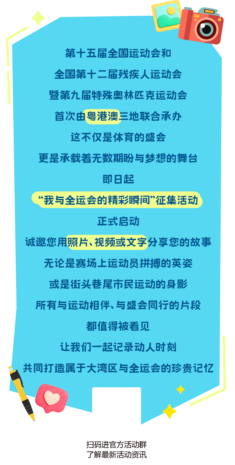本次活动已在微信公众号、视频号、微博、抖音、小红书等平台同步开通专属话题 #我与全运会的精彩瞬间#!无论你是想晒出珍藏的老照片、分享热血的观赛故事,还是展示幕后的筹备片段,只需在发布作品时带上该话题,并@南方网 活动官方账号,按照各平台提示上传相关作品与信息,就能让你的全运记忆被更多人看见,与千万网友一起重温体育激情,共赴湾区全运之约!